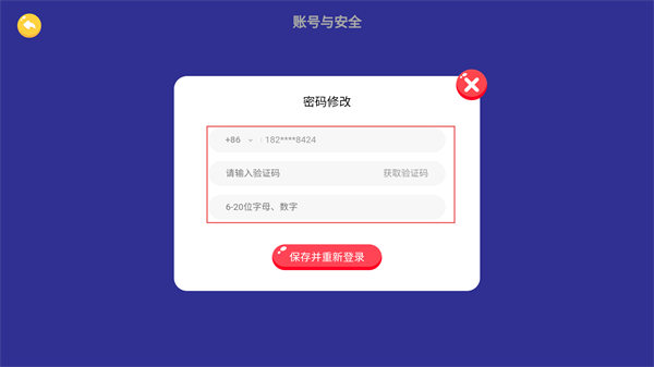 4、在密码修改弹窗中,点击【获取验证码】并填写收到的验证码,输入新密码后,点击【保存并重新登录】按钮,即可完成密码修改。