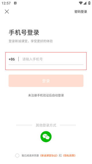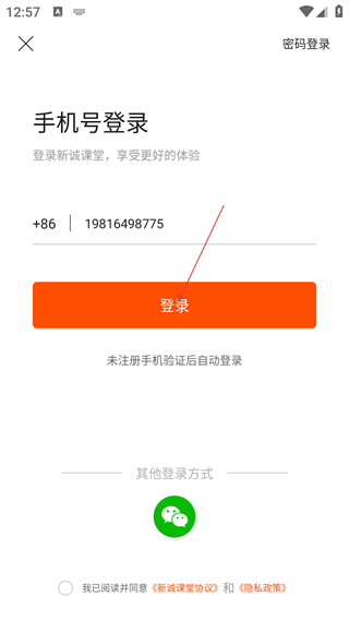 2、在手机号登录界面,输入手机号,勾选《新诚课堂协议》和《隐私政策》,点击【登录】。