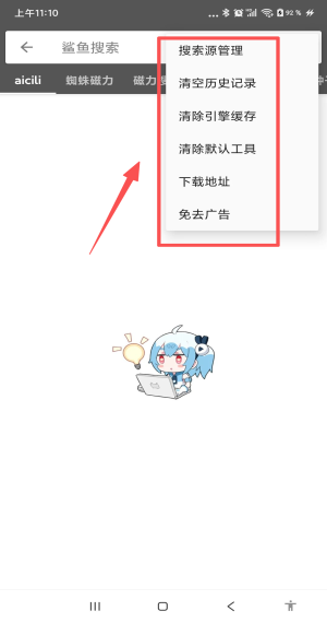 2、进入搜索源管理页,可清历史缓存并开启免广告模式。