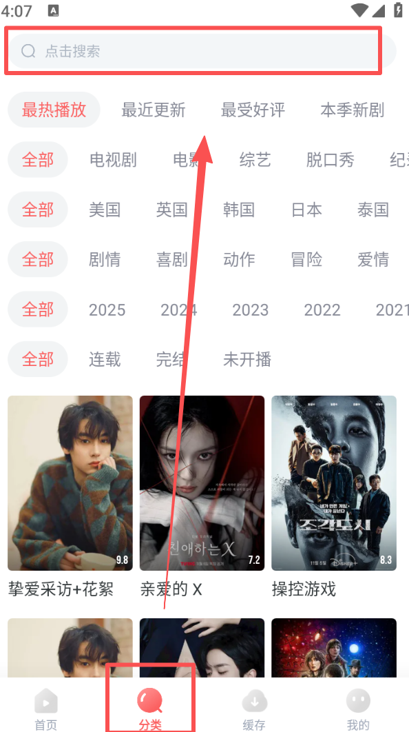 1、打开该影视软件分类,点击上方搜索图标,进入搜索页面。