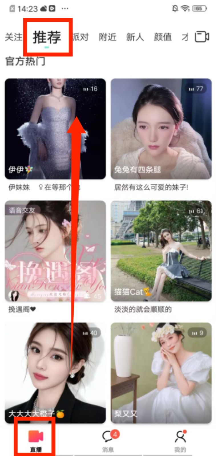 2、进入后点击底部 “直播”,在 “推荐” 栏可浏览官方热门的直播内容,挑选感兴趣的直播间。