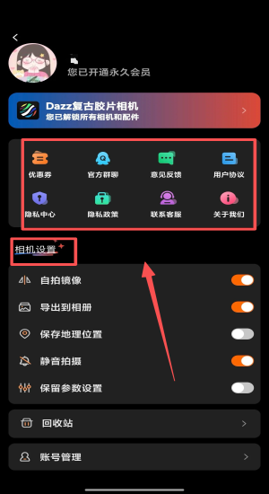 4、开通永久会员后,在设置里开启导出与静音拍摄等高级权限。