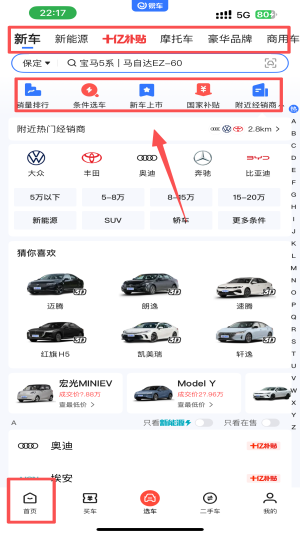 2、选择车型:在首页点击“新车”或“二手车”选项,选择您想要的车型。