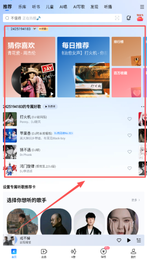 2、进入主界面后,用户可以根据自己的喜好选择热门音乐、MV推荐以及个性化频道,以方便快捷地找到心仪的音频内容,提升使用体验。