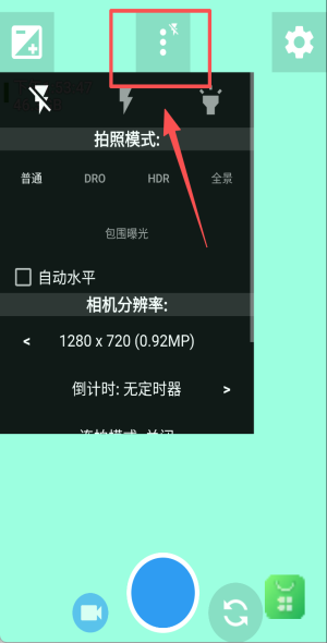 2、在拍照模式菜单选择“普通”,将分辨率调至1280×720并关闭自动水平仪。