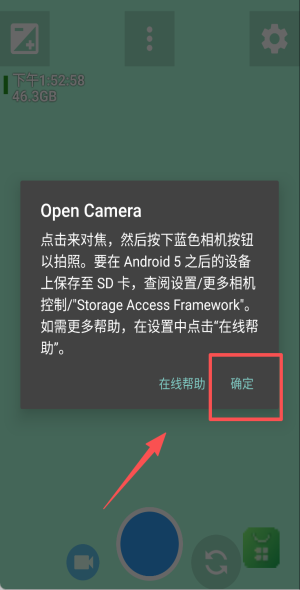1、进入OpenCamera,先点击画面中央锁定焦点,再按下蓝色圆形快门键拍照。