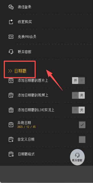 4、在设置页打开“添加日期戳到图片”,选系统日期 2025/12/09,拍照即自动叠加复古戳。