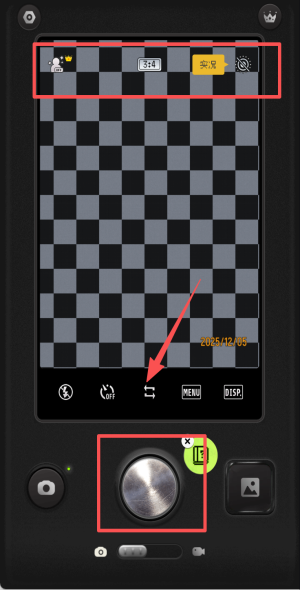 2、进入拍摄界面,选择 3:4 画幅并开启“实况”,轻触 DISP 即可实时预览漏光效果。