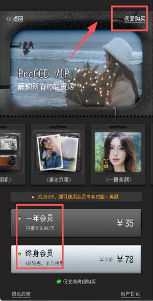 3、若需美颜,点“成为VIP”选一年¥35,微信登录完成支付后自动解锁全部功能。