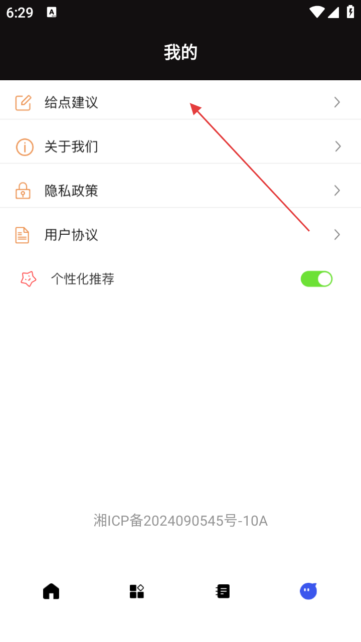 2、在【我的】页面点击【给点建议】选项,进入建议反馈页面。