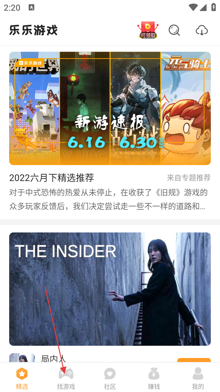 1、在乐乐游戏首页,点击底部【找游戏】选项,可进入找游戏页面。
