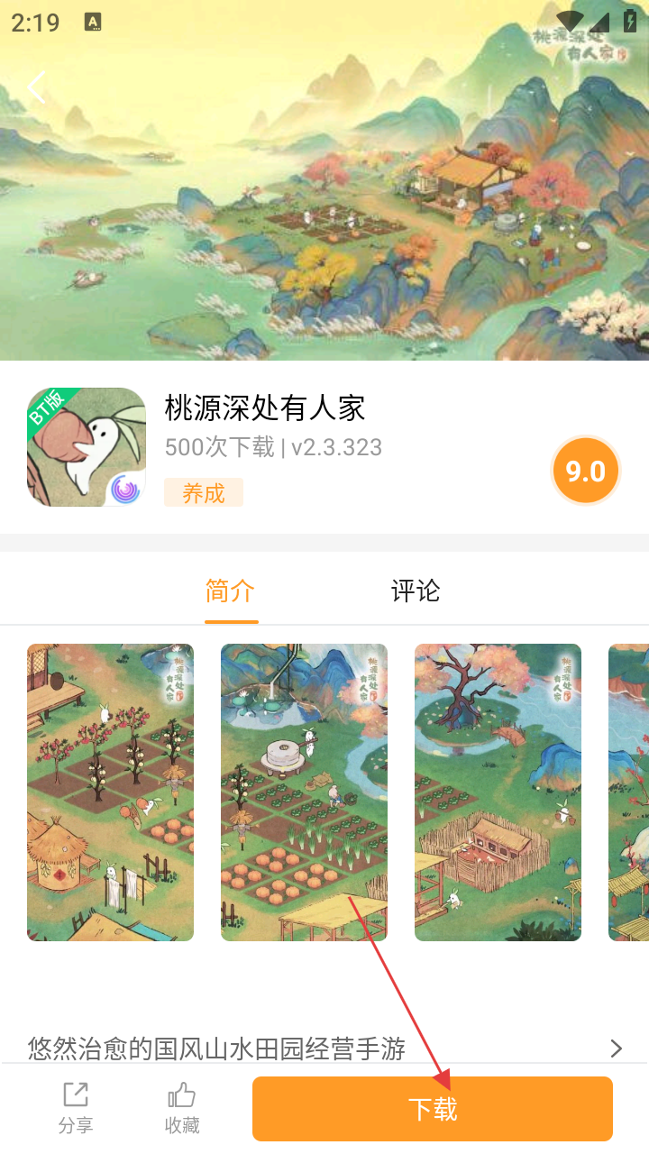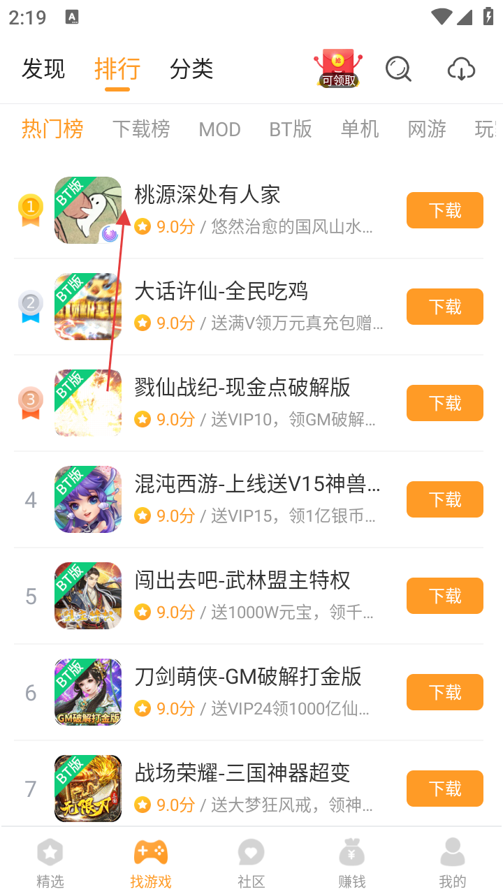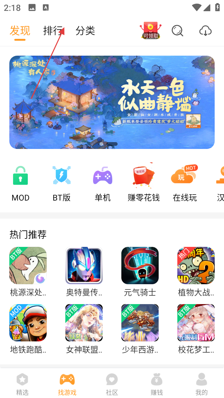 3、在游戏排行页面,可查看热门榜游戏,点击感兴趣的游戏如【桃源深处有人家】可进入其详情页面。