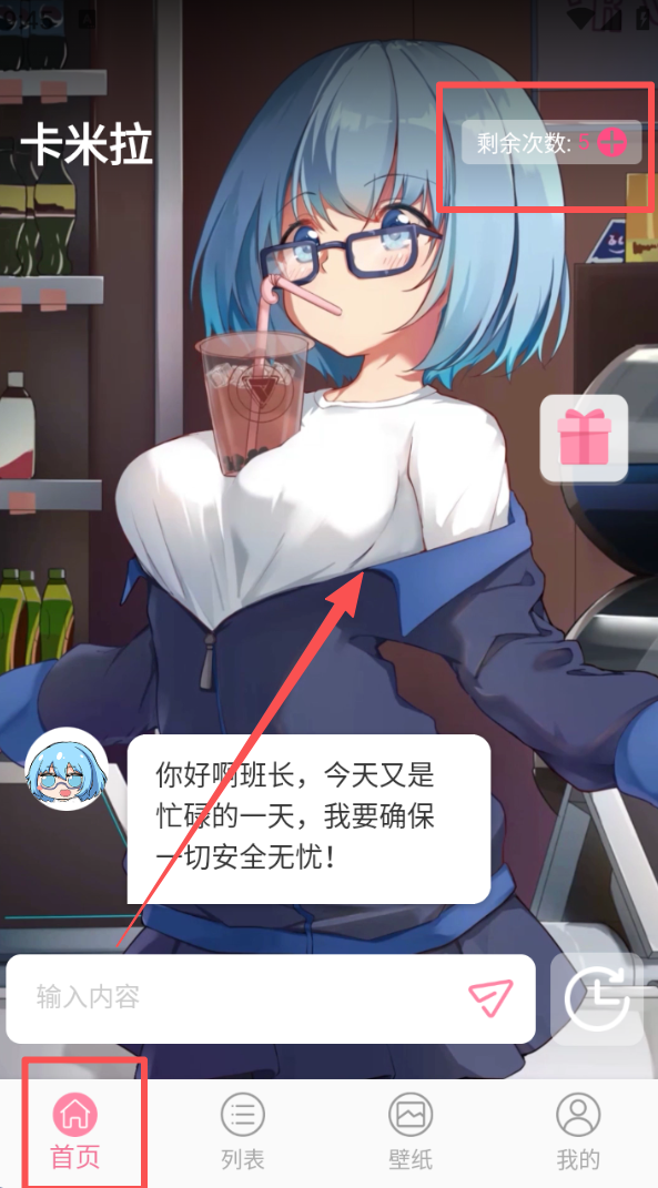 1、进入首页,与卡米拉互动,查看剩余互动次数,在输入框填写内容完成对话交流。