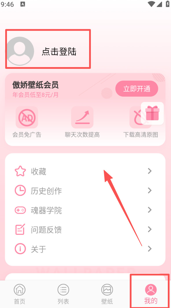 4、进入 “我的” 页面,点击 “点击登陆” 完成账号操作,管理收藏、历史创作等个人内容。