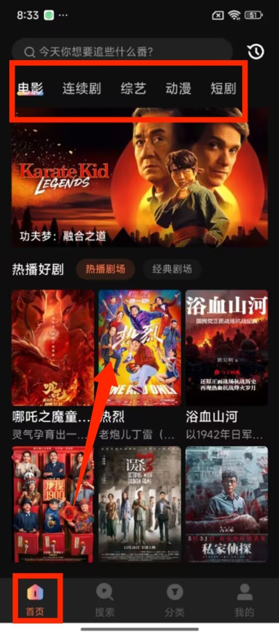 1、进入首页,在 “电影”“动漫” 等分类下,可浏览热播好剧板块的内容,选择想看的影视资源。