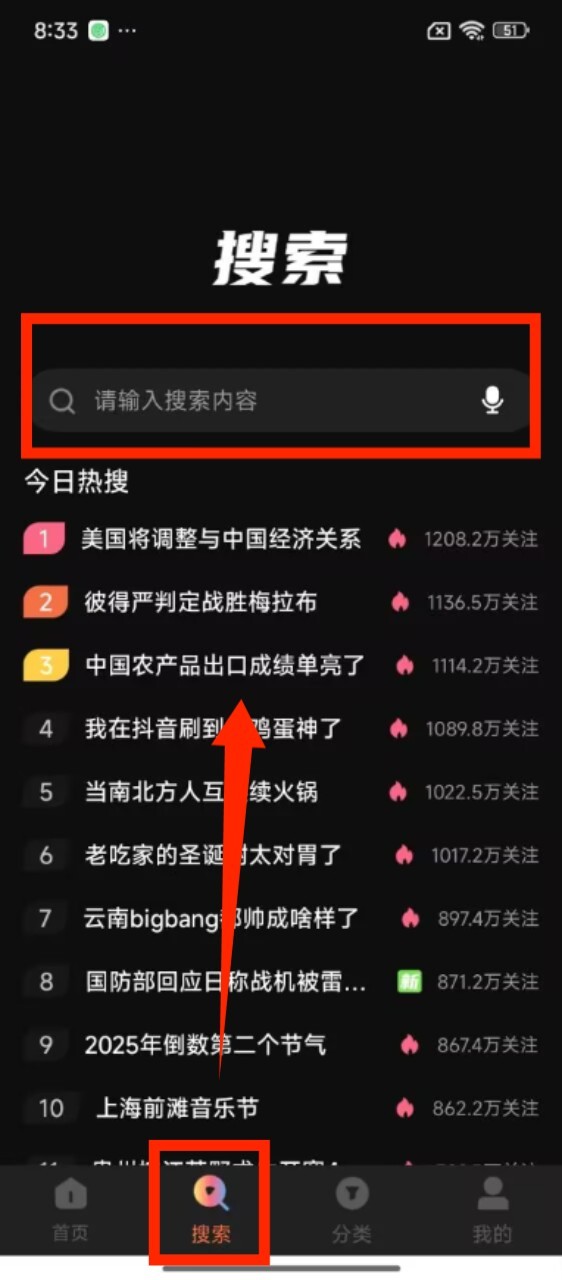 2、切换到搜索页面,在搜索栏输入内容查找影视,也能查看今日热搜榜单,了解热门内容。