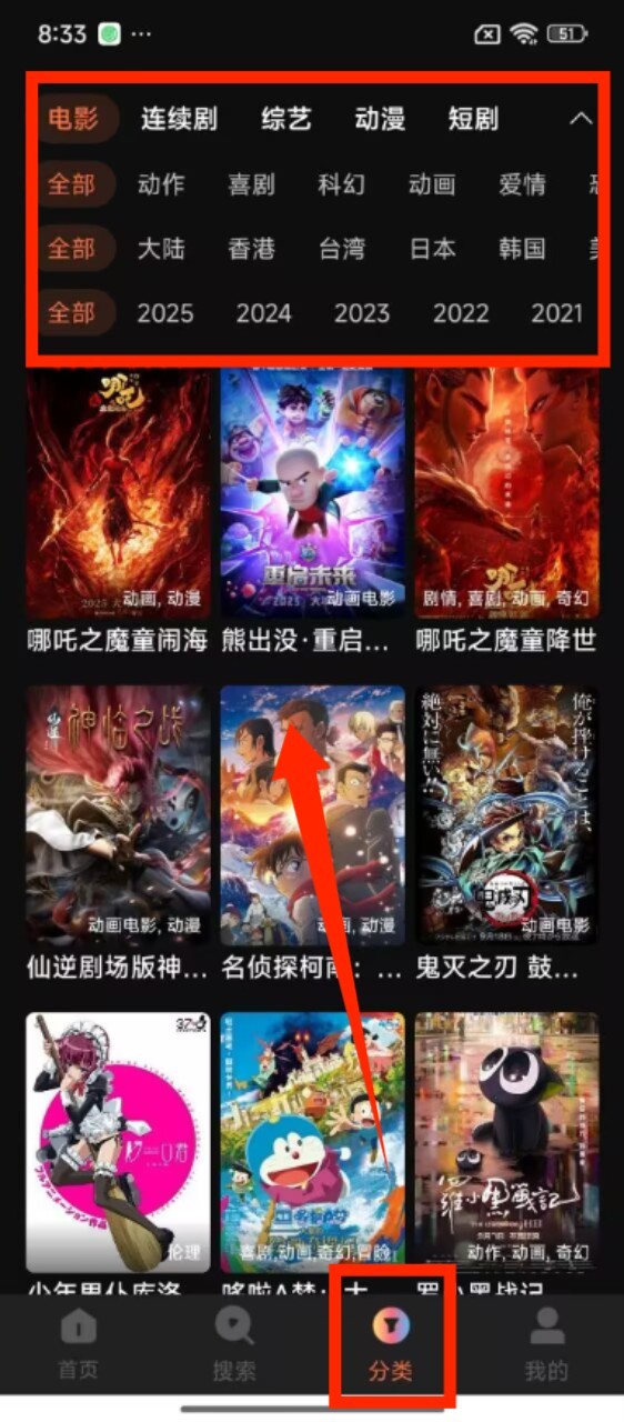 3、打开分类页面,通过 “类型”“地区”“年份” 等筛选条件,精准查找对应类别的影视资源。