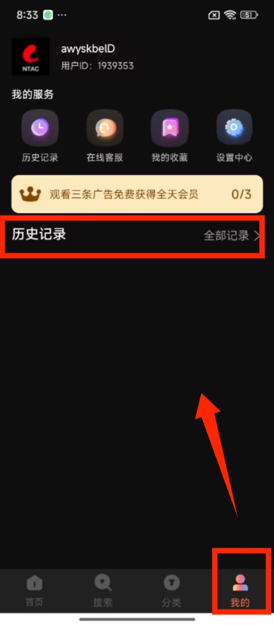 4、进入 “我的” 页面,在历史记录板块查看观影足迹,也能使用我的收藏、设置中心等功能。