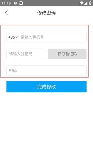4、在修改密码页面,依次输入绑定的手机号、获取并填写短信验证码、设置新密码,点击【完成修改】按钮即可完成密码更新。