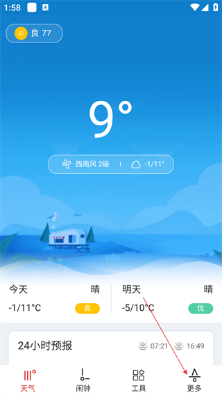 1、在天气主界面,点击底部【更多】选项,进入功能扩展页面。