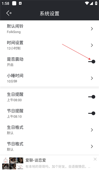 3、在系统设置中,点击“是否震动”的开关,可切换其启用/关闭状态。