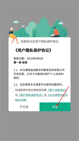 1、首次打开App时,在“注册协议及用户隐私保护协议”弹窗中勾选同意选项,点击【同意】按钮,进入登录/注册选择页面。