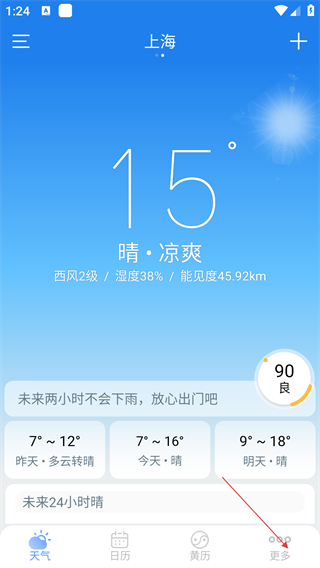 1、在天气主界面,查看上海实时天气及未来时段预报,点击底部【更多】进入功能页。