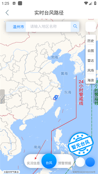2、在功能页选择【实时台风】选项,进入台风路径查询界面,可查看指定地区的台风动态。
