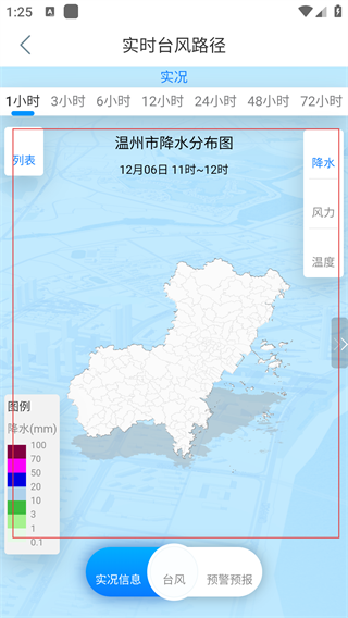 3、在实时台风页面,点击【实况信息】,可查看对应地区的降水分布等实况数据。