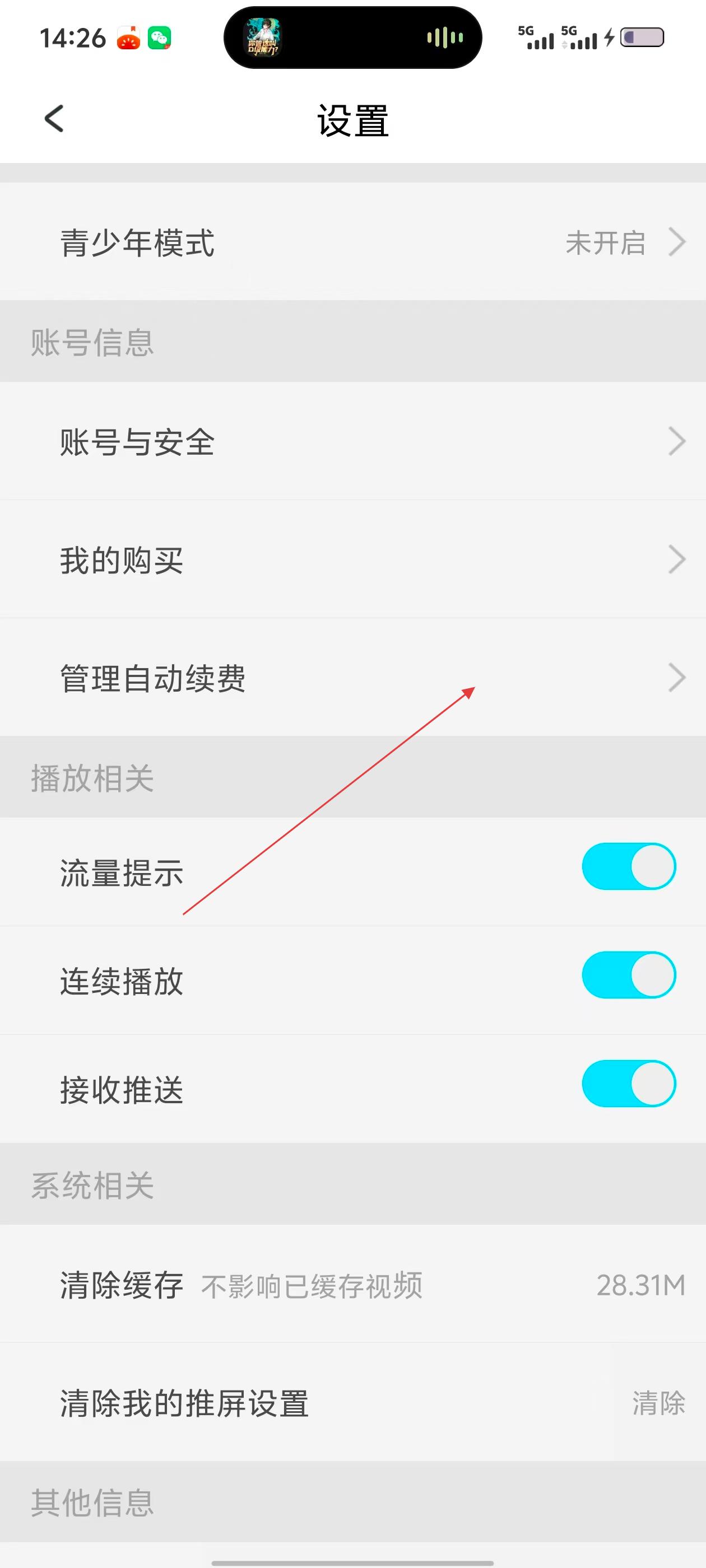 3、进入设置界面后,点击【管理自动续费】选项,进入管理自动续费页面。