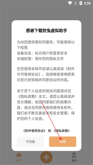1、首次打开狡兔虚拟助手,阅读《软件使用协议》和《隐私政策》后,点击【同意】按钮,进入应用。