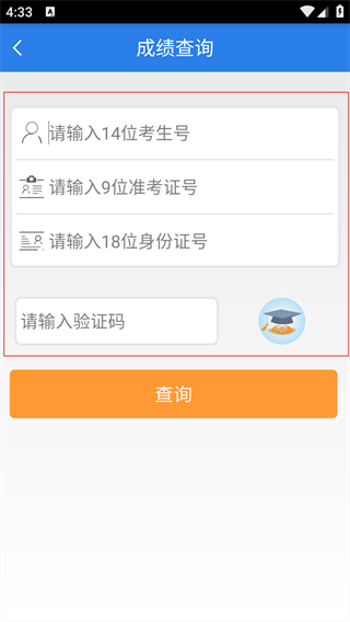 3、在成绩查询页,依次填写14位考生号、9位准考证号、18位身份证号,并输入对应验证码。