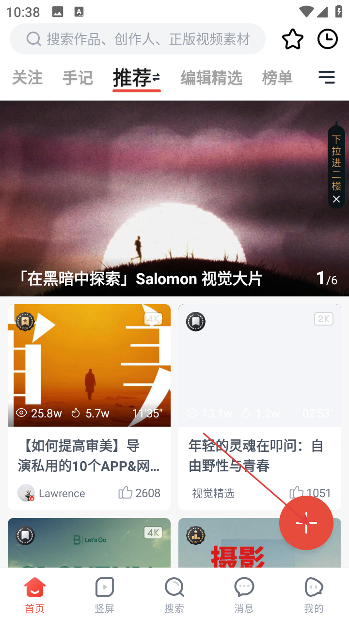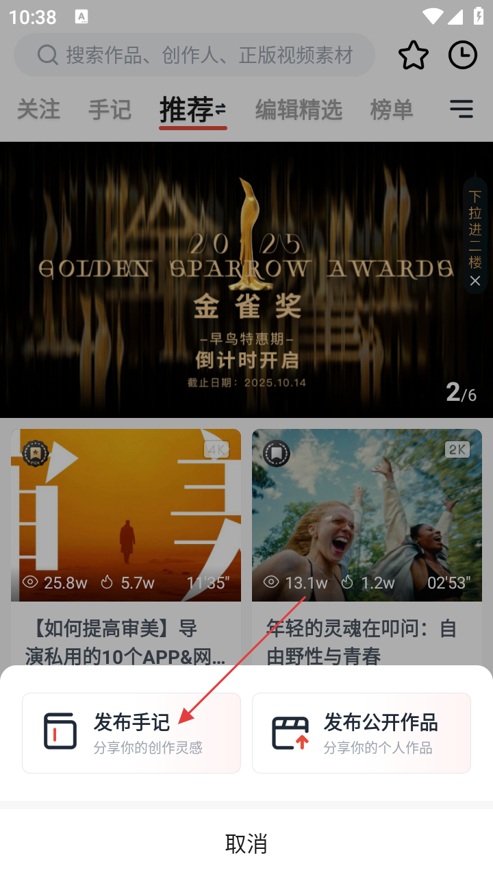 1、在新片场首页,点击右下角红色加号按钮,弹出发布选项菜单。