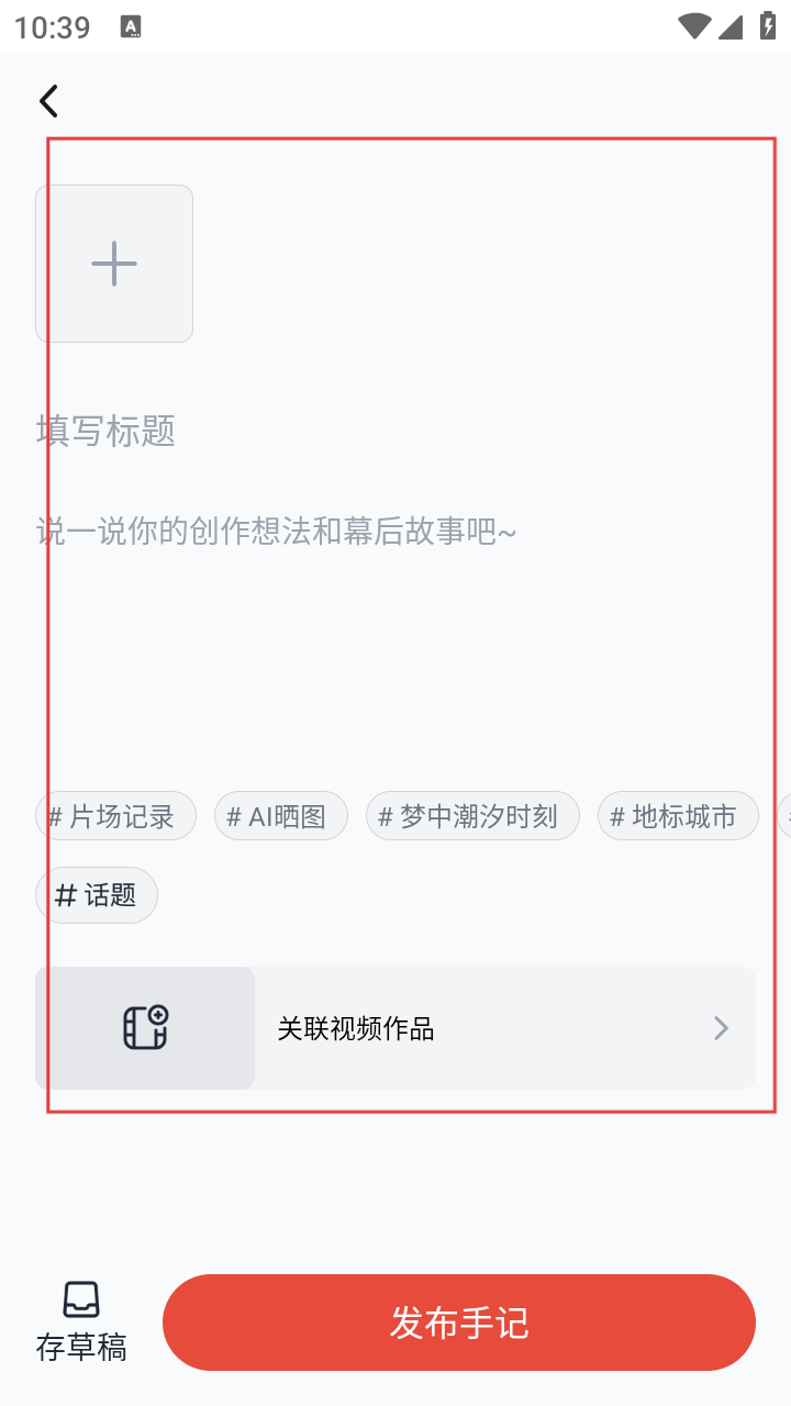 3、进入手记编辑页面后,添加图片,填写标题、创作想法等内容,还可选择话题、关联视频作品。