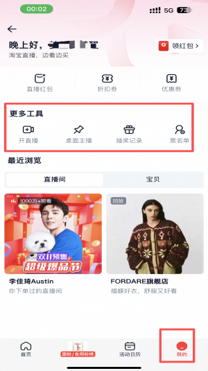 4、使用更多工具:在“我的”页面点击“更多工具”,使用开直播、桌面主播等功能。