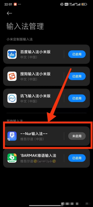 2、进入输入法管理界面,找到Nur输入法,将其从“未启用”状态切换为启用状态。