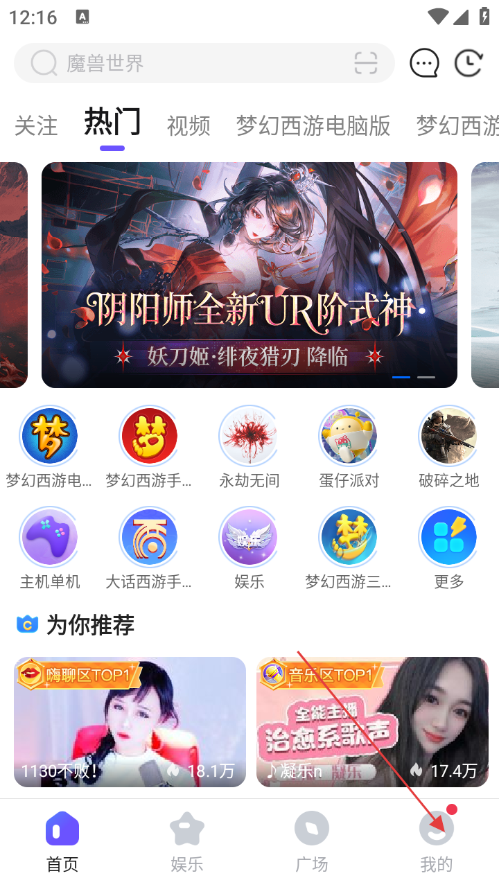 1、在直播平台首页,可浏览热门游戏推荐、为你推荐的主播等内容,点击【我的】进入个人页面。