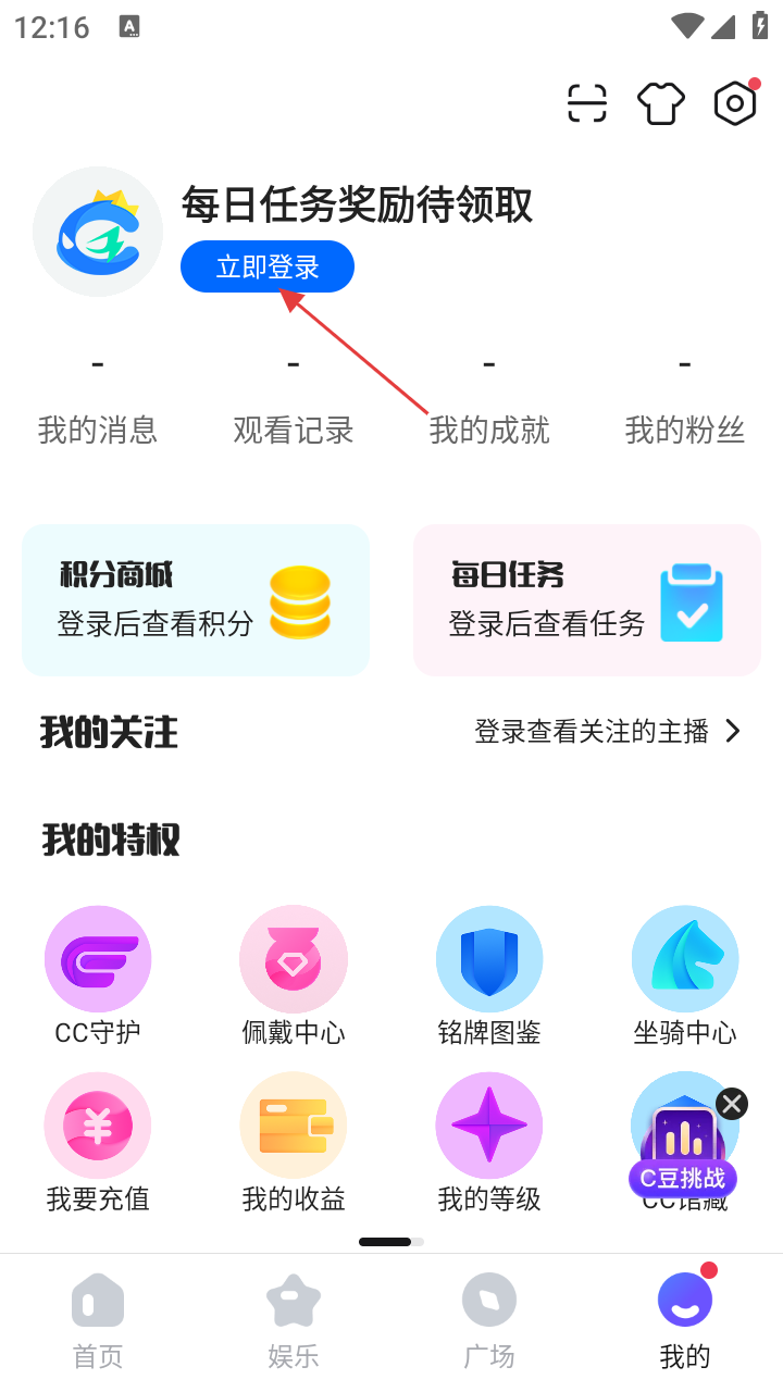 2、在【我的】页面,点击【立即登录】可进入登录界面,还能查看我的消息、观看记录、积分商城等功能。