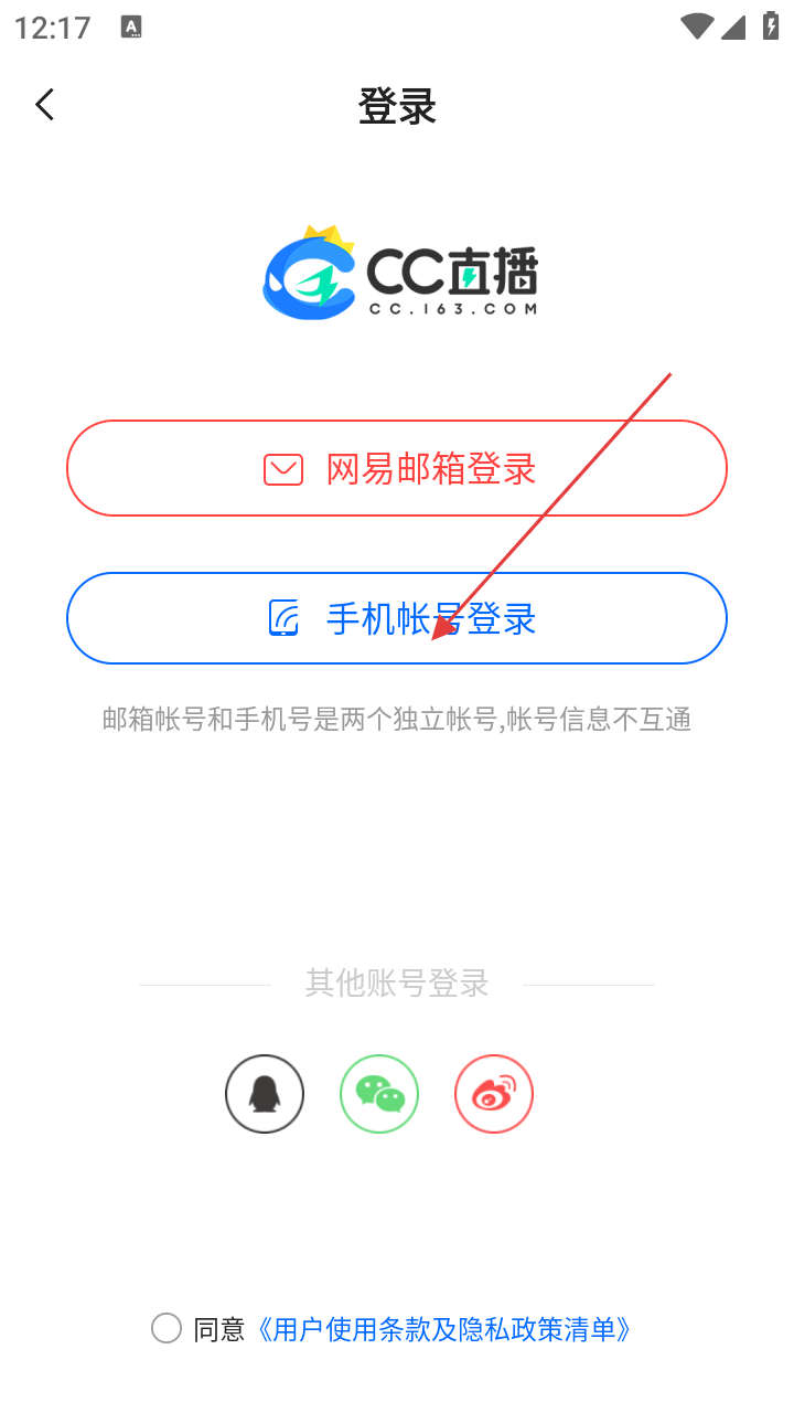 3、在登录界面,可选择网易邮箱登录、手机帐号登录或其他账号登录方式,选择手机帐号登录需勾选同意相关协议。