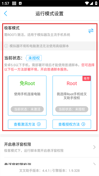 4、在【运行模式设置】界面,可选择【免Root】或【Root】方式激活权限,按提示完成操作以启用脚本功能。