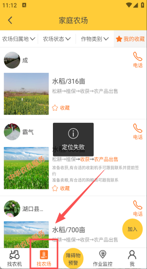 3、浏览家庭农场列表点击收藏,查看作物面积与作业流程并电话联络。