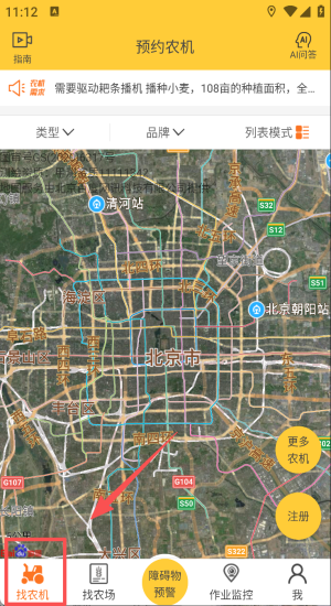 2、进入首页使用预约农机与AI问答,按类型品牌快速筛选周边机械。