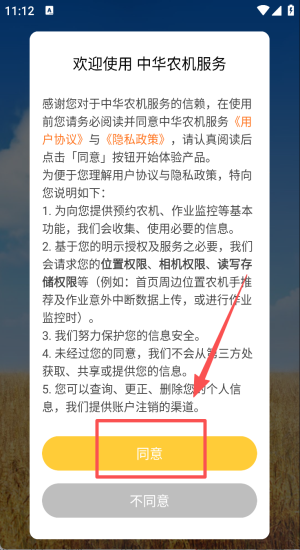 1、阅读用户协议与隐私政策后点击“同意”,授权位置相机存储权限。