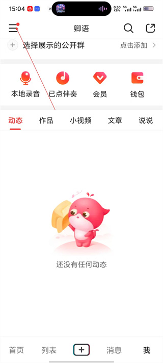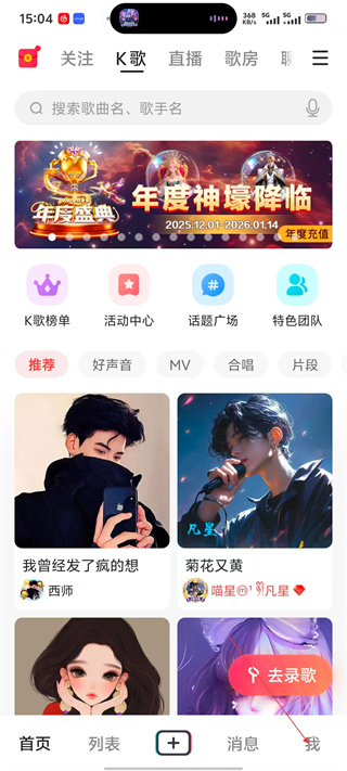 1、在【K歌】页面可浏览推荐作品,点击底部【我】进入个人中心,查看账号相关功能入口。