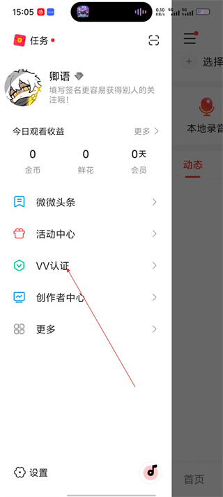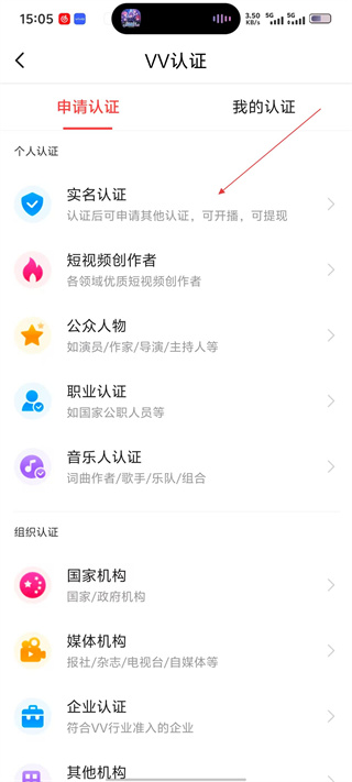 4、【VV认证】页面提供多种认证类型,其中【实名认证】是基础认证,完成后可申请其他认证、开播及提现。