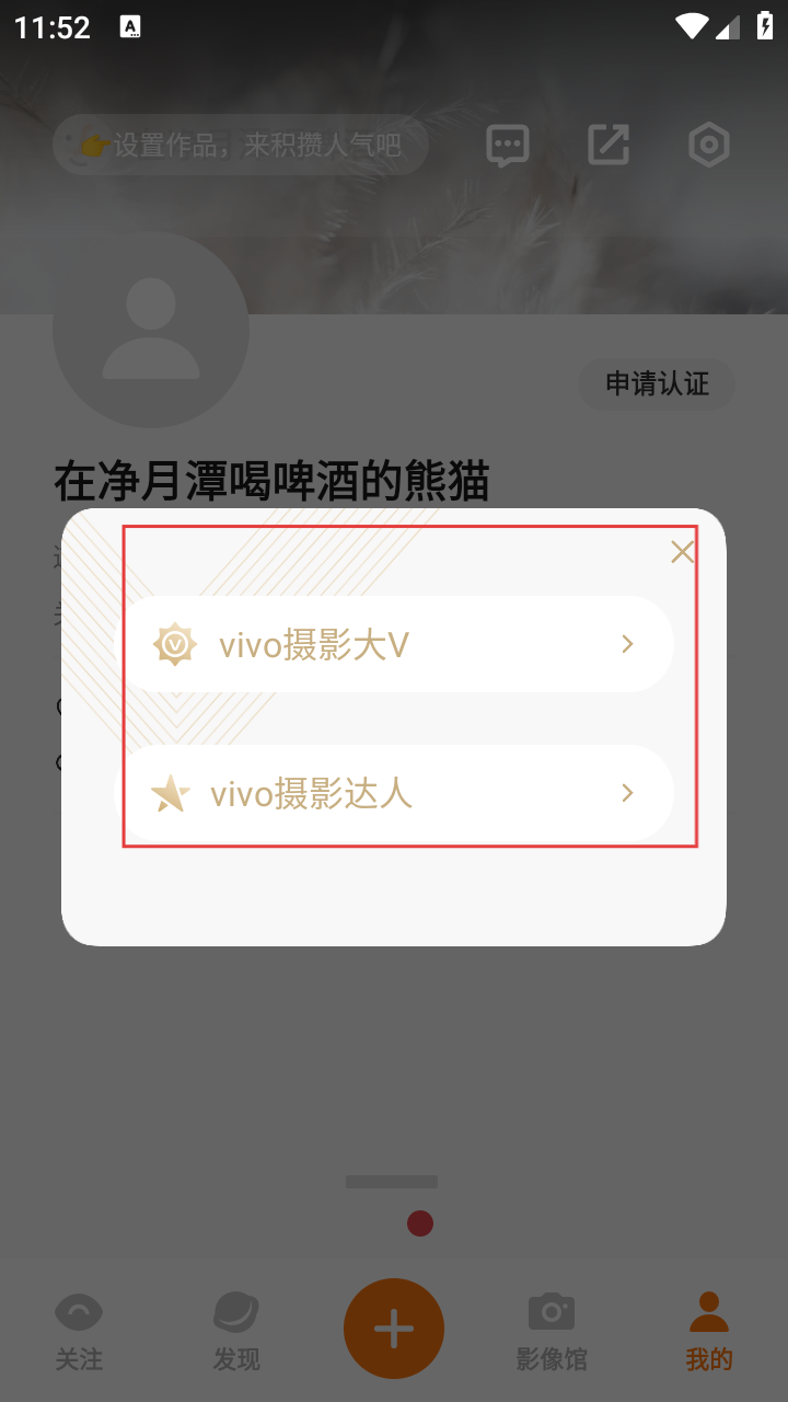 2、进入【我的】界面后,点击【申请认证】选项,弹出认证类型选择框,可选择“vivo摄影大V”或“vivo摄影达人”。