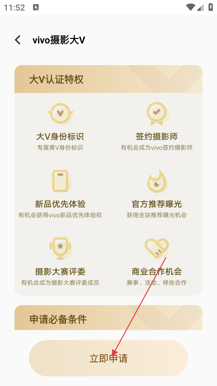 3、选择【vivo摄影大V】选项,进入大V认证界面,可查看大V认证特权和申请必备条件。