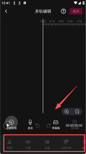 3、在多轨编辑界面,使用底部工具栏进行音频剪辑和调整。