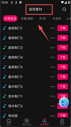 4、在音效素材页面,搜索并下载所需音效素材进行创作。