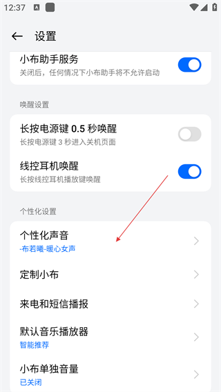 3、在【设置】页面中,可调整【小布助手服务】开关,还能点击【个性化声音】选项自定义助手的语音风格。